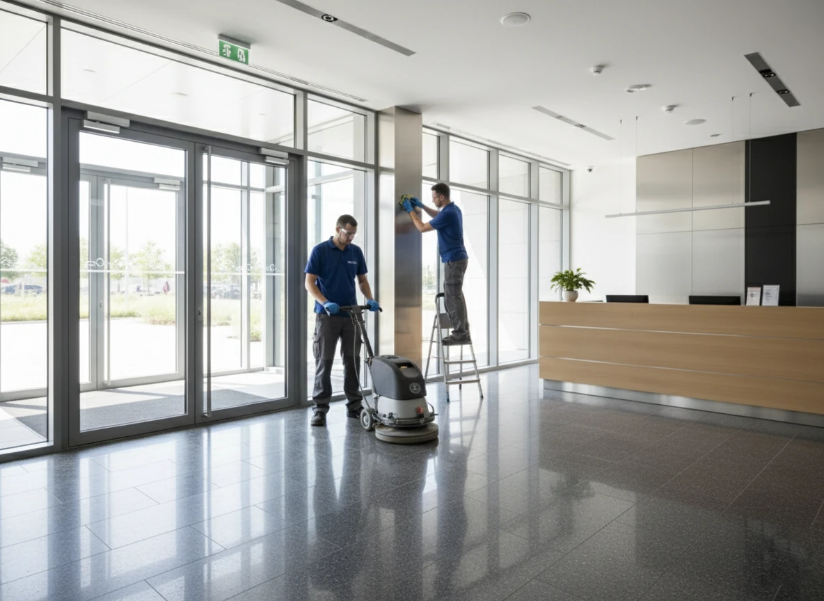 Detailed cleaning and polishing of floors, glass doors, and reception